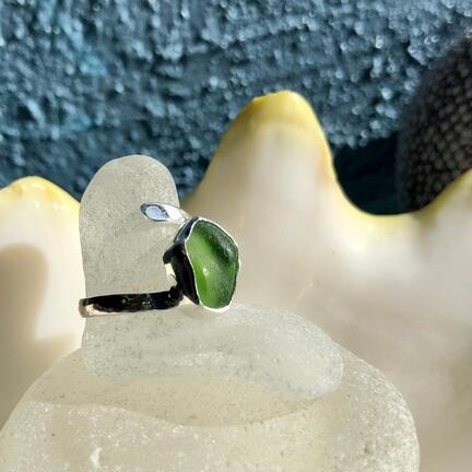 Smuk Havfruering i Sterling sølv, med indfattet grønt havglas.