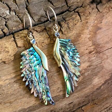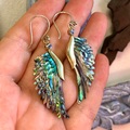 Smukke øresmykker, detaljeret udskåret i Abalone skaller, der er indfattet i messing.