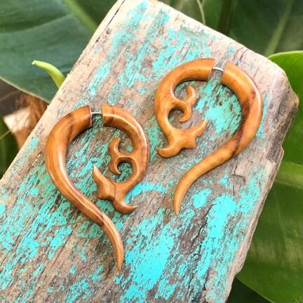 Smukt hånd-udskårne øreringe i bæredygtigt frugttræ.